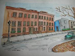 ヨーロッパの古い町並みの中に溶け込むように描いていますが、現実は区画整理された住宅街です。現実のとおりに描いてもつまらないので、石で構築された歴史ある町並みと、鉄板の外壁のコントラストを表現してみました。