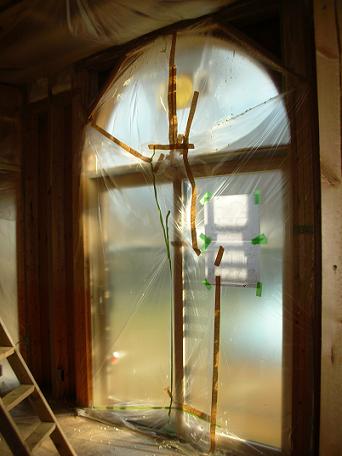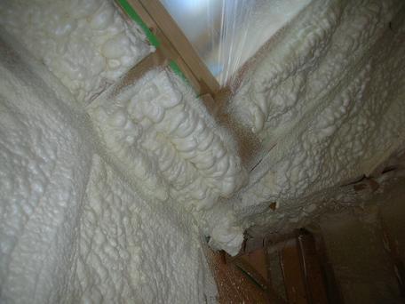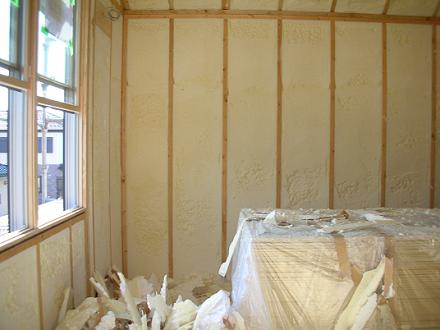 吹きっぱなしの状態です。柱や屋根のタルキからはみ出した部分をカッターで取り除きます。