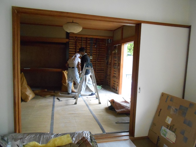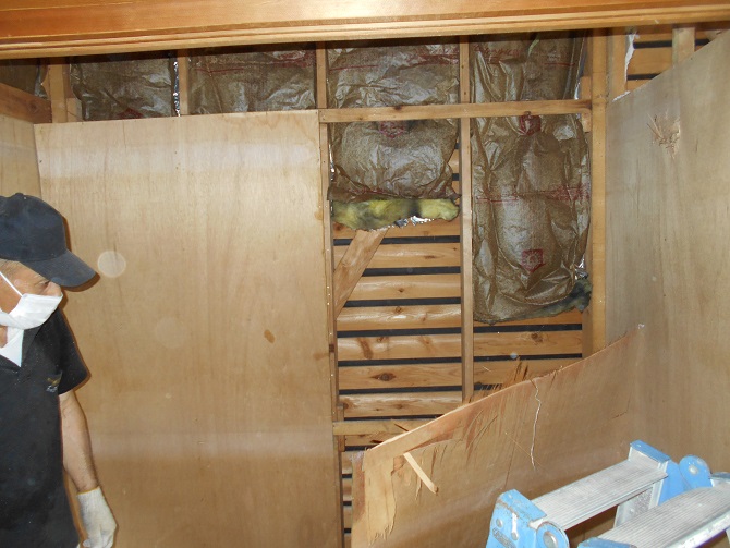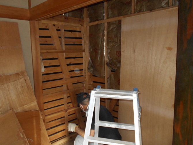 壁のボードを撤去後、シロアリ、断熱、雨漏れなど、問題のある部分があるかどうかチェックします。