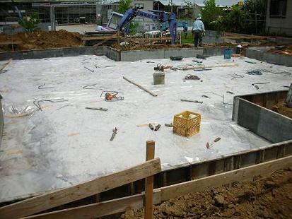 柱状改良工事が終わり充分な養生期間を取った後、基礎工事に入っている「TT」計画です。ベース下防湿シートが張り終わっていますが、何点かの指摘事項を職人さんに伝え、その場で是正するように指導しました。