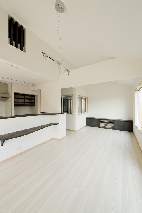キッチンカウンター、バックキャビネット、ロフトの格子、テレビカウンターなど造作家具の部分は、黒の自然塗料で塗装しています。