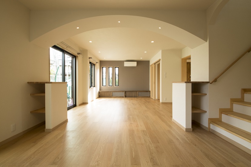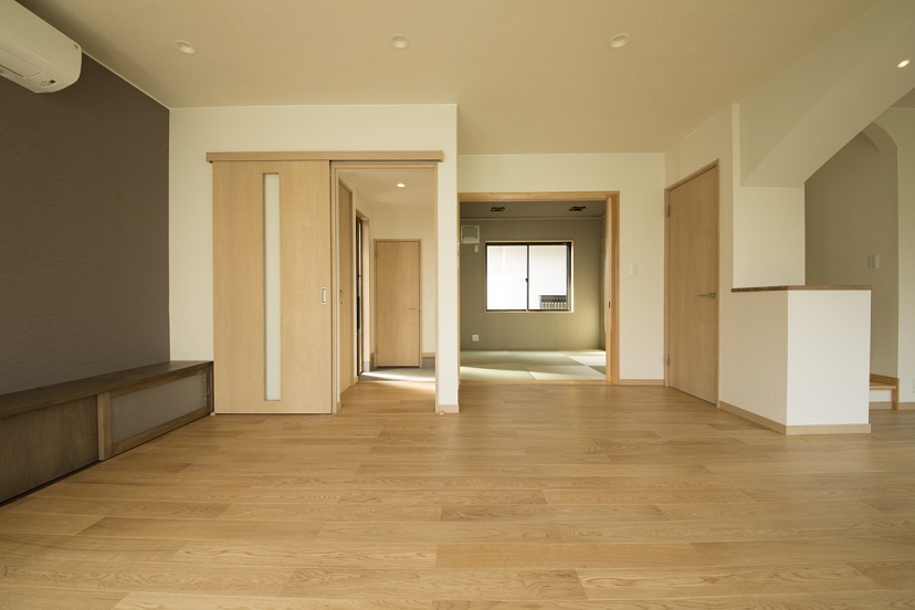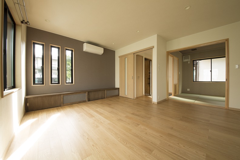 テレビカウンターは床と壁に固定し、建具を付けた様子。