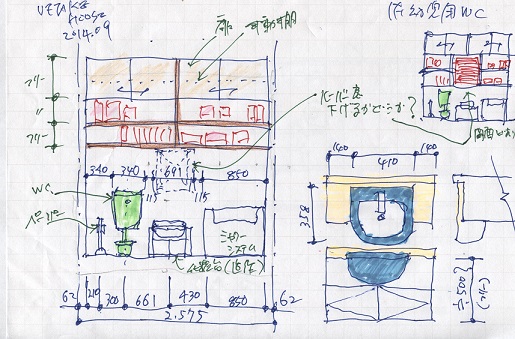 幼児用トイレ・シャワー室に、造作工事で作る収納の検討をしています。 余白のスペースを活用し、使いやすさと収納効率を考えて設計していきます。