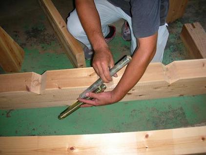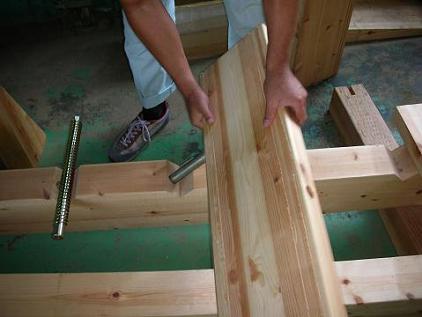 茨城県内にあるプレカット工場の見学に行きました。目的はプレカットを見るのではなく,壁から片持ち梁で階段材をはね出す、ボルトの納まりを見るためです。 写真はささら桁に段板を取り付けるものですが、はね出すスタイルでも使用するボルトは同じくらい太いものです。ささら桁がないと、段板が壁から飛び出し宙に浮いているような感じに見えます。現在計画中の「KJ」計画の断面計画を考えていまして、採用するか検討しているところです。
