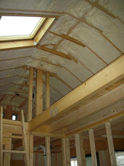断熱材はご覧のとおり、グラスウールやロックウールなどの壁にはめ込んでいくものではなく、したがって隙間などが極めておきにくい現場発泡断熱材です。ロックウールなどでも施工をきちんとすれば問題ないのですが、断熱性能もこちらの方が優れていますので、もっぱら現場発泡断熱を採用し、「世界基準」に限りなく近づけています。