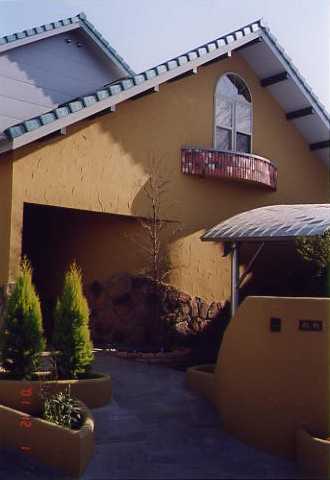 シャープな2層切妻屋根の三州瓦と、外壁腰部分に貼られたストーン、そして床のレインボーストーン(天然石)は、カーキーイエローの外壁と絶妙なコントラストを醸し出している。 大きな弧を描くプランタンボックスに、ハーフラウンドサッシ。 ゆるやかな曲線を描くエントランスアプローチ。 その右側には、3次曲線銀世界4CAR GARAGEから ALFA156が出番を待つ。