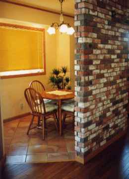 2階のリビングから、ダイニングの方を眺める。 ブリック、テラコッタ、オークフローリングがとても親しみやすく、溶け合っているかのようだ。